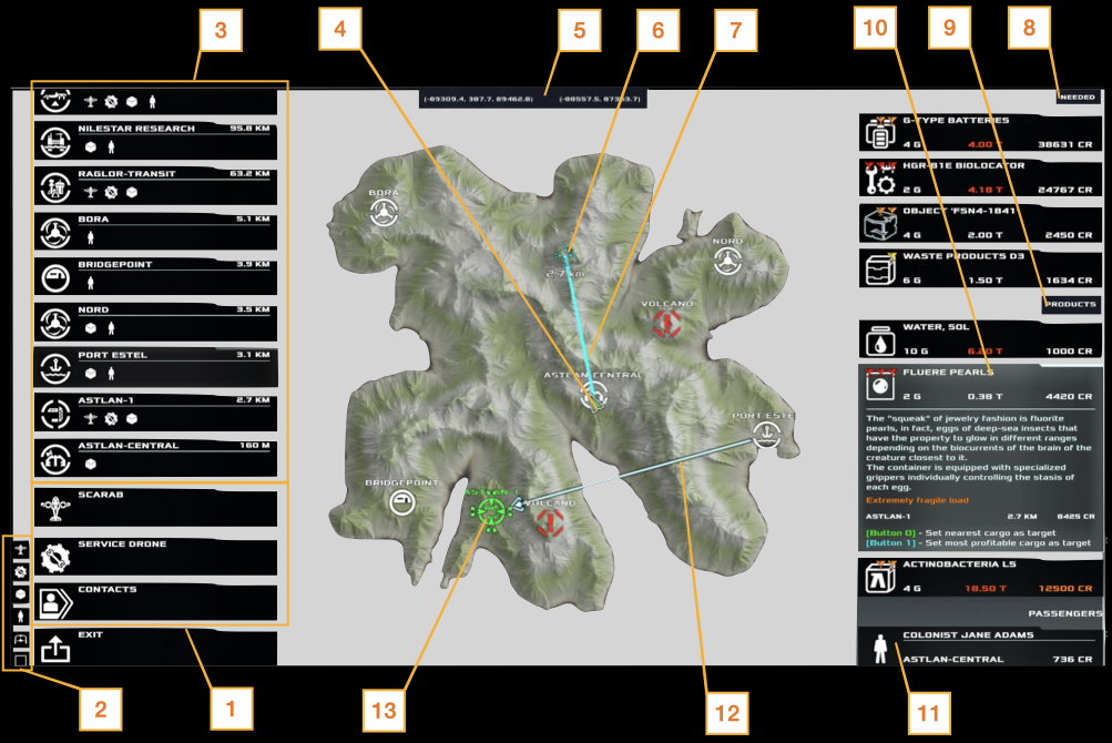 | 1. Map Services – Switches the display between Map/Trade mode and Contacts mode, and allows calling of a Service Drone. 2. Base Filters – Filters the display of Bases depending on those which offer (top to bottom) aircraft purchase; aircraft repair/upgrades; cargo; passengers; TODO: unknown; and TODO: unknown. 3. Bases – A list of all airbases that match the filter criteria from above. Selecting a base will make its detail appear on the right side of the screen. 4. Player Position – The player’s aircraft. 5. Cursor Coordinates – Map coordinates under the mouse cursor. 6. Waypoint – Clicking the map can create a user waypoint which will show on the map and in the HUD MiniMap (see Flight – Instruments). 7. Route Line – You can create a route by creating multiple waypoint. They will be joined by a line on this map. The HUD MiniMap displays the next waypoint in the route until it is overflown, then automatically sequences the next waypoint. | 8. Base Detail, Needs – When a Base is selected, this section shows products (cargo) the base wishes to buy, and the offered purchase price. 9. Base Detail, Offerings – When a Base is selected, displays products (cargo) the base has for sale, and the purchase price the player must pay. 10. Product Detail – Selecting a product shows more detail: G-tolerance; weight; purchase price; and a description. If the player has Targeted another Base, the sale price there will also be shown. 11. Base Detail – Passengers – When a Base is selected, this section displays Passengers desiring transport, the fare they will pay, and their destination. 12. Trade Line – When a Product is selected and a destination base is Targeted, this line shows the route from the “buy” Base to the “sell” Base. 13. Targeted Base – A Base selected as a destination. |